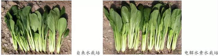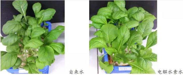 分別用自來水和電解水素水調制培養液,在栽培小松菜時,觀察到電解水素水的栽培期間的EC(培養液中養分濃度的指標)比自來水低了不少。這可以說明在使用電解水素水時養分的吸收更加充分。