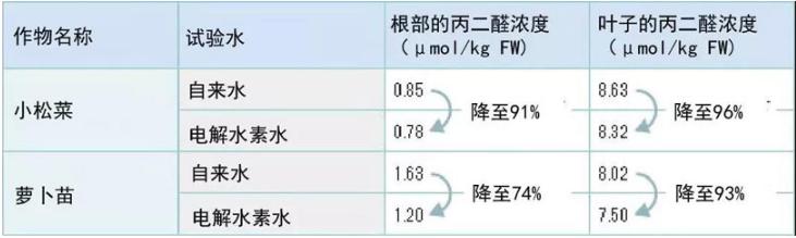 用電解水素水栽培的小松菜和蘿卜苗,其氧化應激指標“丙二醛”明顯下降了。由此可見,電解水素水的催生機制是與其抗氧化作用所帶來的氧化應激水平下降存在關聯。