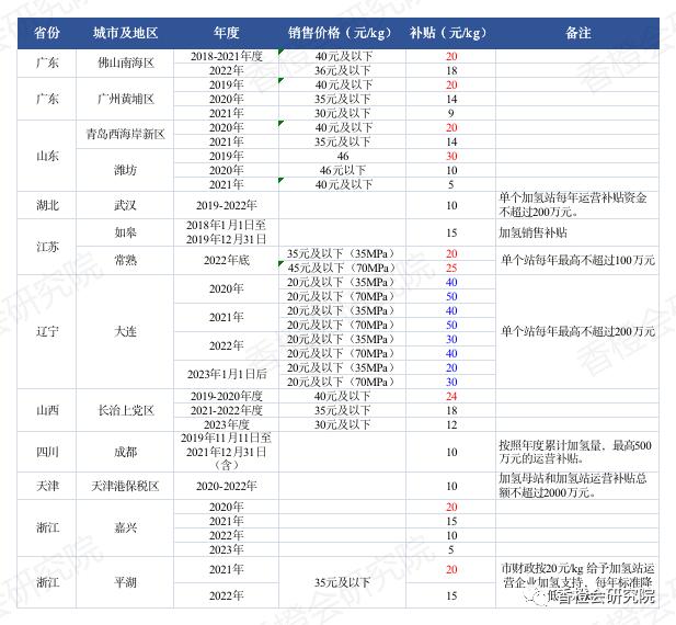 4、13個地方有加氫運營補貼,大連力度最大