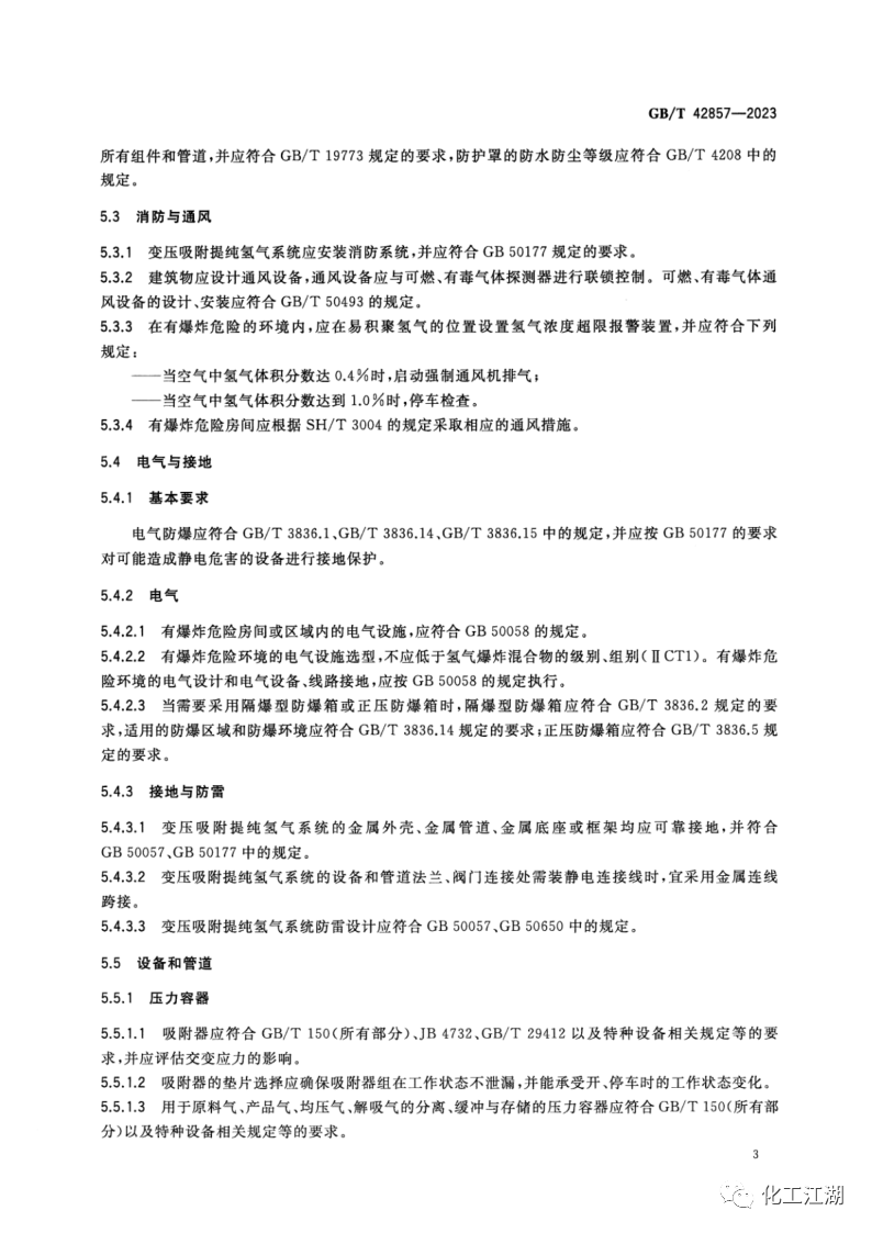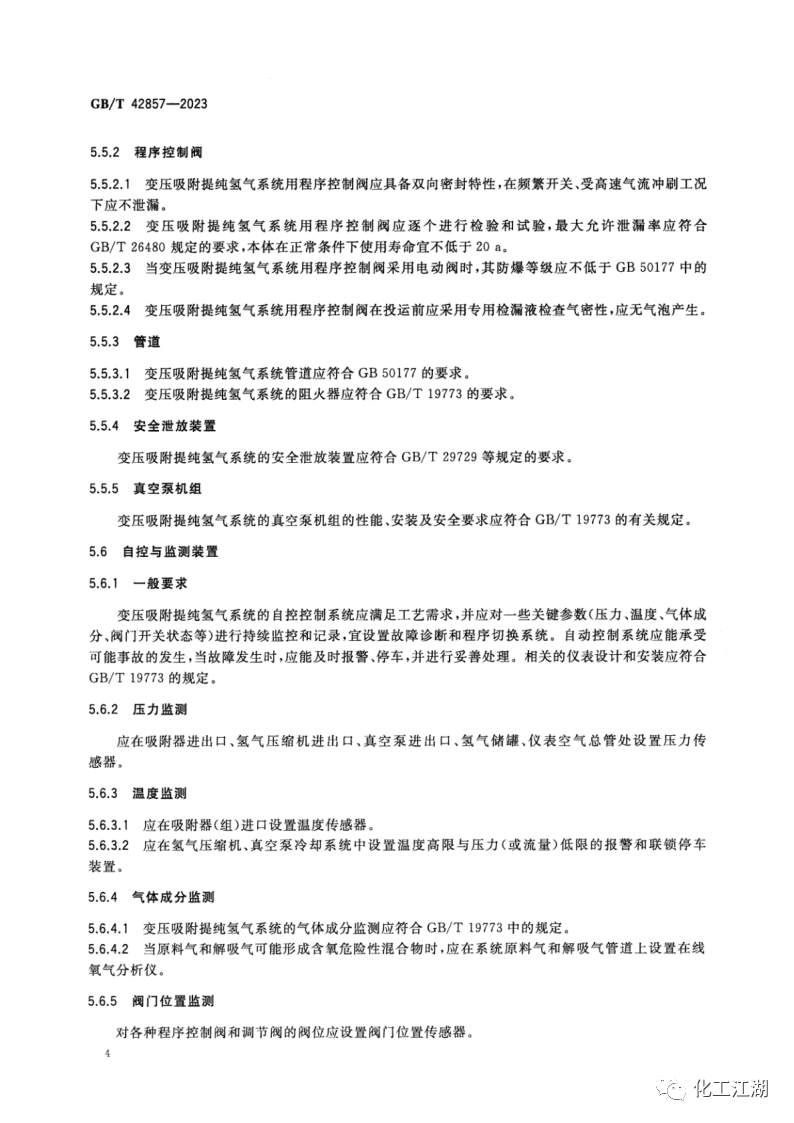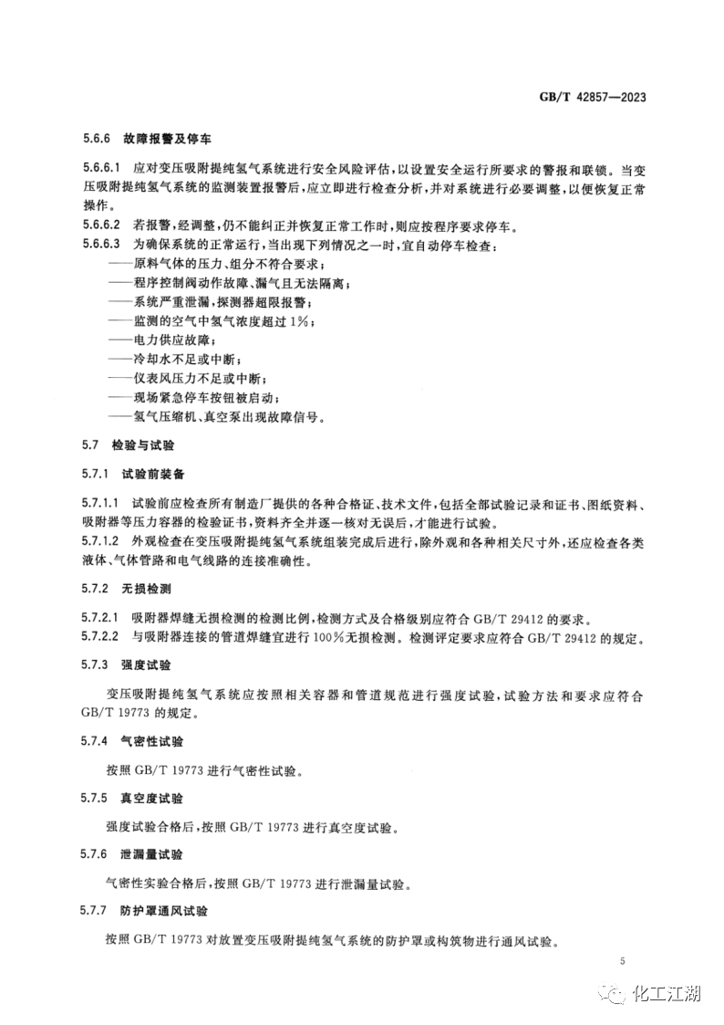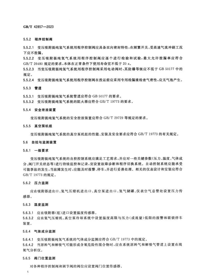 本標準規定了PSA系統的布置、建筑物、消防與通風、電氣與接地、設備和管道、自控與監測裝置、檢驗與試驗等方面的要求。其中,自控與監測裝置包括壓力監測、溫度檢測、氣體成分監測、閥門位置監測、故障報警及停車等內容;檢驗與試驗包括無損檢測、強度試驗、氣密性試驗、真空度試驗、泄漏量試驗、防護罩通風試驗等內容。此外,本標準還規定了操作和維護、作業人員、應急情況處理等方面的要求。