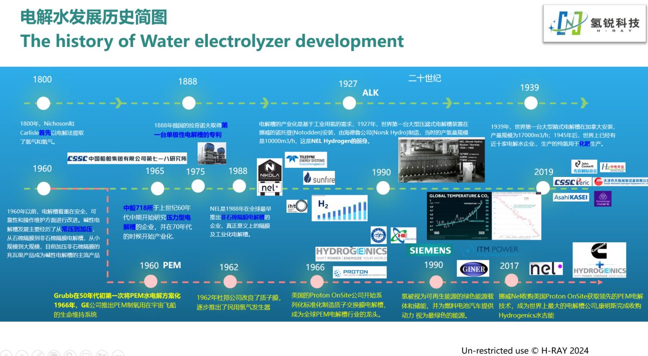 他介紹到:回望電解水技術商業發展可以從1800年開始,由Nichoson和Carlisle首先以電解法提取了氫氣和氧氣。 直到1927年,世界第一臺大型壓濾式電解槽裝置在挪威的諾托登(Notodden)安裝,由海德魯公司(Norsk Hydro)制造,當時的產氫量規模也達到了10000m3/h,這是NEL Hydrogen的前身,當時生產的氫主要用于合成氨, 1945年前后,世界上已經有近十家電解水企業,而且全部是堿性電解水工藝。