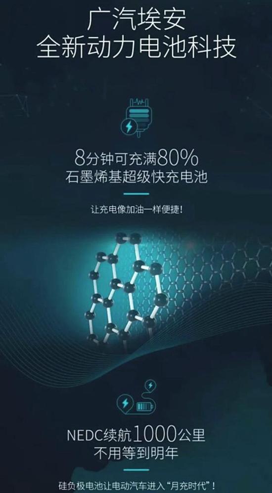 但最引人注目的還要數石墨烯電池,本月15日,廣汽集團官方發布傳聞已久的“黑科技”。廣汽集團研發的的石墨烯快充電池具備6C快充能力,最快8分鐘就能充電至80%,同時,電池能量密度可達到280Wh/kg左右,車輛續航里程有望突破1000km。如此算來,充電時間已經可以媲美燃油車的加油時間,而續航更是遠超傳統汽車,新能源車型備受桎梏的續航問題似乎將不復存在,未來可期。