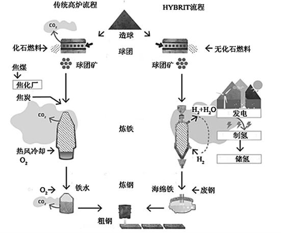 2016年,瑞典鋼鐵、瑞典大瀑布電力和瑞典礦業聯合成立了HYBRIT項目,目前處于試驗階段,2035年實現商業化運行。工藝流程:高爐煉鐵過程中用氫氣替代煤和焦炭,氫氣在較低的溫度下對球團礦進行直接還原,并從爐頂排出水蒸氣和多余的氫氣。