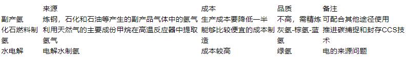 結合目前的實際情況來看,氫氣的來源可多種方式配合。副產氫,主要矛盾點在純度不高和后期逐漸減少,可精煉使用,且后期逐步減少該渠道來源。化石燃料氫,傳統制氫中會大量排放CO2 ,但不符合減碳的目的,在此情況下碳捕捉和封存CCS技術得到了推進,將生產中的副產品CO2有效捕捉、封存和運輸,其中需要完善捕捉技術,還需研發并生產封存CO2的鋼材。水電解,水電解產生的氫完全符合后期規模使用的標準,但其中的關注點在電解的經濟性和電的來源,后期主要降低電解的單位成本的同時解決電的問題,而目前發電方式主要有火力發電和再生資源發電。
