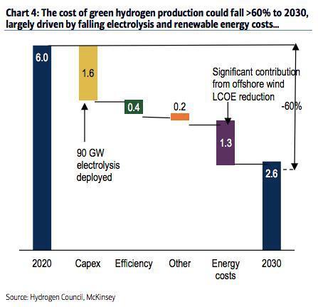 美銀美林數據顯示,用于生產綠色氫的電解槽和可再生能源成本在過去5年中已下降了50%。