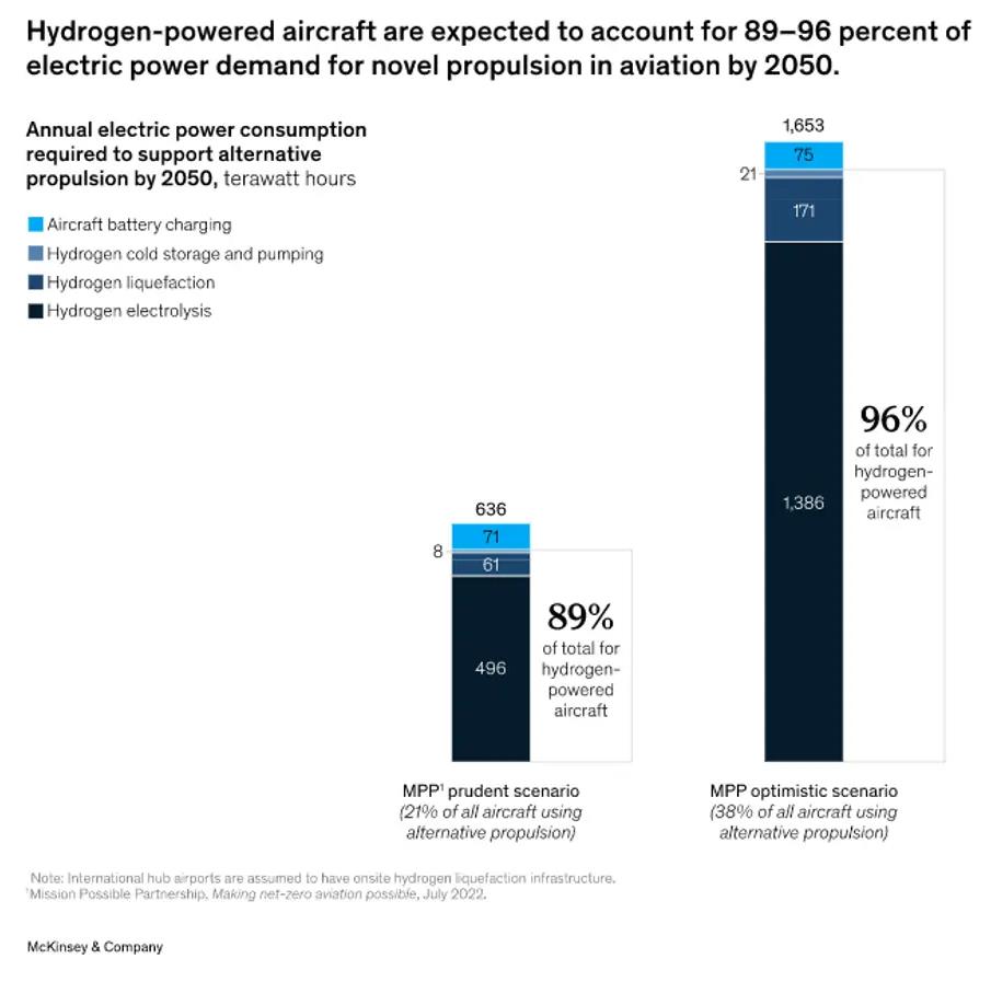氫啟未來網獲悉,根據麥肯錫公司發布的一份報告,到2050年,氫能飛機將占所有飛機的38%。替代動力需要在2050年之前全球范圍內產生600至1700兆瓦時的清潔能源,相當于全球最大的十幾個風力發電站或一個像比利時那么大的太陽能發電站的總能量。