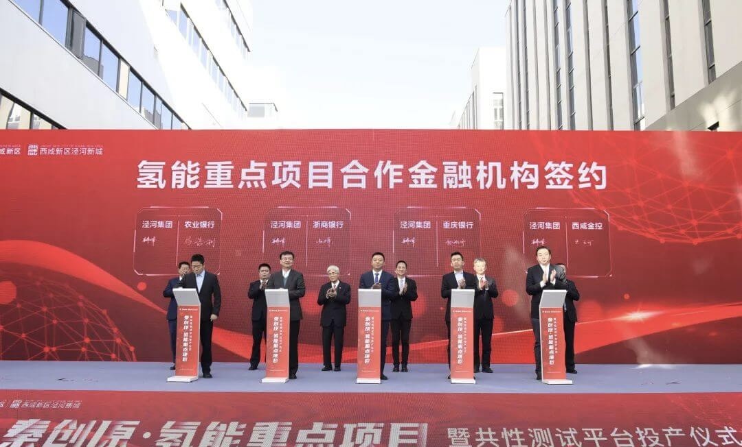 陜西旭氫時代科技有限公司董事長王海峰代表公司發言。王總表示,旭氫時代氫燃料電池堆產線的投產,標志著陜西省首個以氫燃料電池為核心的產業化示范項目正式落地,這是公司深入貫徹落實陜西氫能產業規劃部署的務實舉措,對助力打造以西安為中心的氫能裝備研發制造中心具有里程碑式意義。作為氫能產業鏈“鏈上企業”,旭氫時代將以此次投產為新的起點,按照陜西省委、省政府的戰略部署,以集團公司資源和場景優勢聚集發展要素,搶抓氫能產業發展戰略機遇,規劃為先,先行先試,引領陜西氫燃料電池產業發展。首先,做大優勢,夯實公司氫源成本及質量優勢,為氫燃料電池產業化發展提供氫氣儲備;做強技術,深化兩鏈融合,構建自立自強創新研發體系,不斷向產業上下游探尋求索,將氫燃料電池業務打造成為陜西氫能產業發展的新名片;做好配套,健全燃料電池共性測試平臺運營管理體系,為燃料電池產業化提供全方位的用氫-測試服務;做實場景,協同產業伙伴推進氫能重卡示范應用規模化、市場化,3年實現1000輛氫車運營,打造西北示范性優質氫能車輛運營服務平臺;整合資源,高點站位謀劃零碳氫能產業園布局,探索園區綠色發展新路徑,全方位構建氫能產業生態,加快形成新質生產力,為陜西省氫能產業延鏈補鏈強鏈、構建氫能社會、實現綠色低碳發展作出更大貢獻。在簽約儀式環節,涇河集團分別與旭氫時代等8家企業進行了燃料電池共性測試平臺合作簽約,與旭強瑞進行了供氫合作企業簽約,與農業銀行等5家金融機構進行了氫能重點項目合作金融機構簽約。