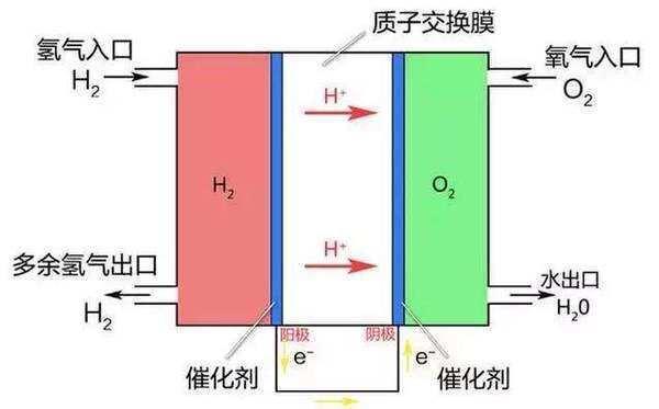 氫燃料電池汽車的工作原理其實很簡單,說的直白一些就是電解水的逆反應。氫燃料電池的結構上有兩塊電極,分別是氫電極和空氣電極(空氣電極主要是需要空氣中的氧氣),在氫電極上供給足夠的氫氣,氫氣在氫電極上被電離生成正1價氫離子(H+),同時空氣電極上提供足夠多的空氣,空氣中的氧氣在電極上被電離生成負2價氧離子(O2—)。在這個過程中,2個氫氣分子(4個氫原子)失去4個電子(4e)變成4 H+,1個氧氣分子(2個氧原子)得到4個電子(4e)變成2O2—,氫離子與氧離子結合后生成水?;瘜W反應方程式為: