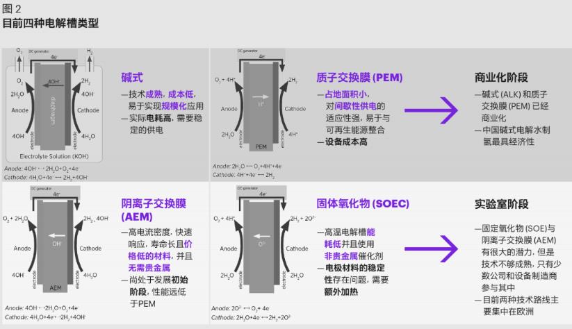 電解槽是綠氫制備的關(guān)鍵設(shè)備,其技術(shù)路線、性能、成本是影響綠氫市場(chǎng)走勢(shì)的重要因素。目前,堿式(AE)電解槽與質(zhì)子交換膜(PEM)電解槽較為成熟,已經(jīng)商業(yè)化。而有很大發(fā)展?jié)摿Φ年庪x子交換膜(AEM)電解槽與固體氧化物(SOEC)電解槽仍處于實(shí)驗(yàn)室階段,技術(shù)不夠成熟(如圖2)。
