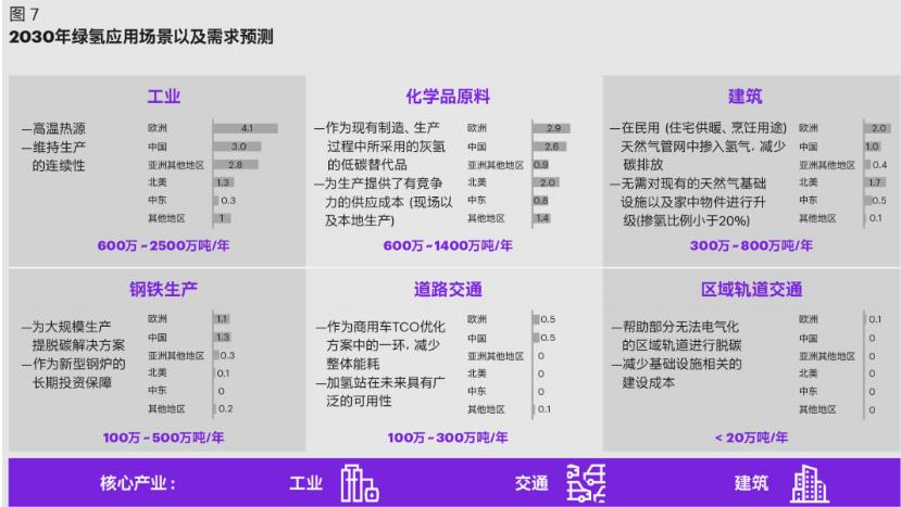 氫能的應(yīng)用領(lǐng)域和場(chǎng)景具有很強(qiáng)的多樣性,除了用作燃料,還可作為原料應(yīng)用于多個(gè)領(lǐng)域進(jìn)行深度脫碳,主要包括工業(yè)原料、工業(yè)供熱、交通運(yùn)輸、住宅取暖、發(fā)電等。其中,氫能是實(shí)現(xiàn)交通運(yùn)輸、工業(yè)和建筑等領(lǐng)域大規(guī)模深度脫碳的最佳選擇(如圖7)。