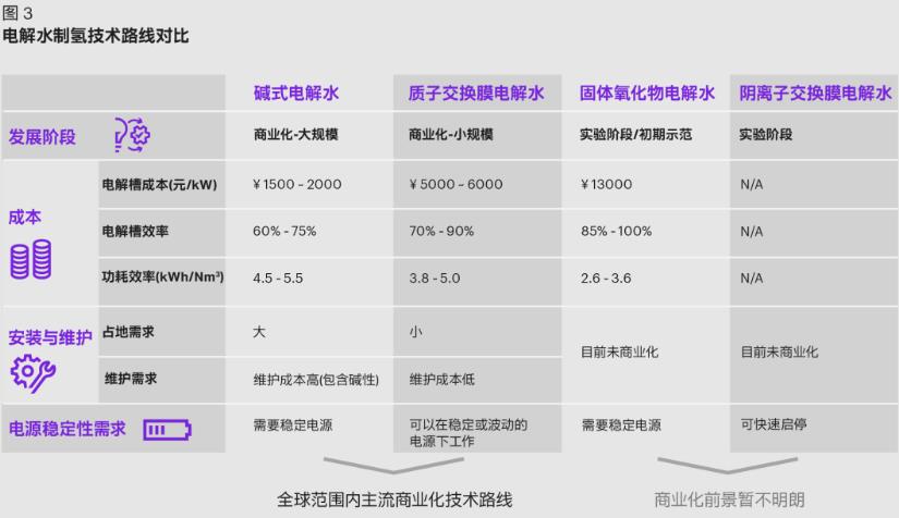 具體來(lái)看,堿式(AE)電解槽和質(zhì)子交換膜(PEM)電解槽是目前全球和中國(guó)范圍內(nèi)具備商業(yè)化能力的唯二路徑,且各有千秋。而對(duì)于中國(guó)來(lái)說(shuō),堿式電解水制氫最具經(jīng)濟(jì)性(如圖3)。