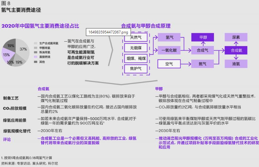 氫是重要的工業(yè)原料。氫在傳統(tǒng)的化工行業(yè)中主要用于煉油,生產(chǎn)氨以及乙醇。合成氨與甲醇是目前中國(guó)氫氣消納的重要方式(如圖8)。