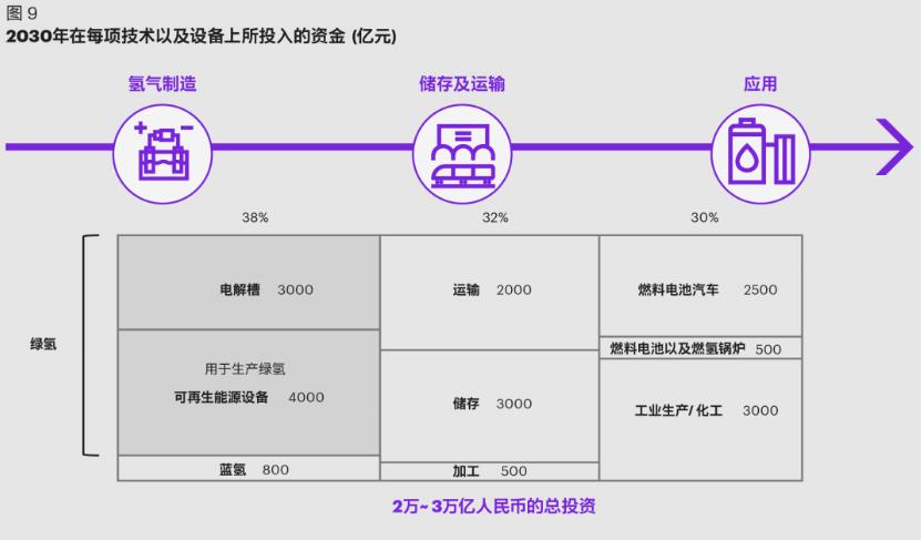 為了形成有效的氫能源體系,提高氫能的技術(shù)經(jīng)濟(jì)性,針對(duì)技術(shù)、設(shè)備和材料的大規(guī)模投資必不可少(如圖9)。這其中,科爾尼認(rèn)為,綠氫的生產(chǎn)、儲(chǔ)存以及供給,和燃料電池是未來(lái)十年的發(fā)展重點(diǎn)。