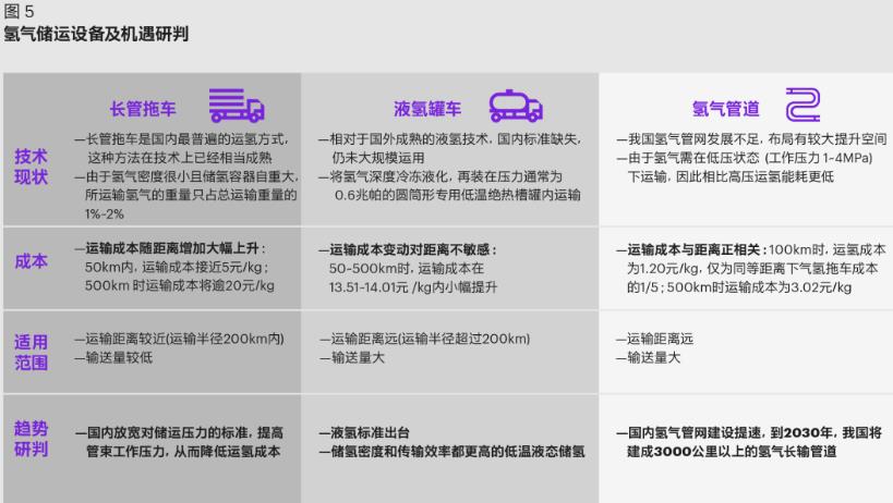 在氫氣運(yùn)輸方面,同樣根據(jù)氫氣狀態(tài)不同,可以分為氣態(tài)氫氣輸送、液態(tài)氫氣輸送和固態(tài)氫氣輸送三種類型,主要的運(yùn)輸方式有長(zhǎng)管拖車(chē)、液氫罐車(chē)、管道運(yùn)輸。長(zhǎng)管拖車(chē)是中國(guó)氫氣運(yùn)輸?shù)闹饕绞?,所需的運(yùn)輸成本與基礎(chǔ)設(shè)施投入相對(duì)較低,但運(yùn)輸規(guī)模與運(yùn)輸半徑較為有限;液氫罐車(chē)將在液態(tài)儲(chǔ)氫技術(shù)發(fā)展的基礎(chǔ)之上逐漸成熟;氫氣管道運(yùn)輸將是中長(zhǎng)期氫氣運(yùn)輸?shù)闹匾M成部分(如圖5)。