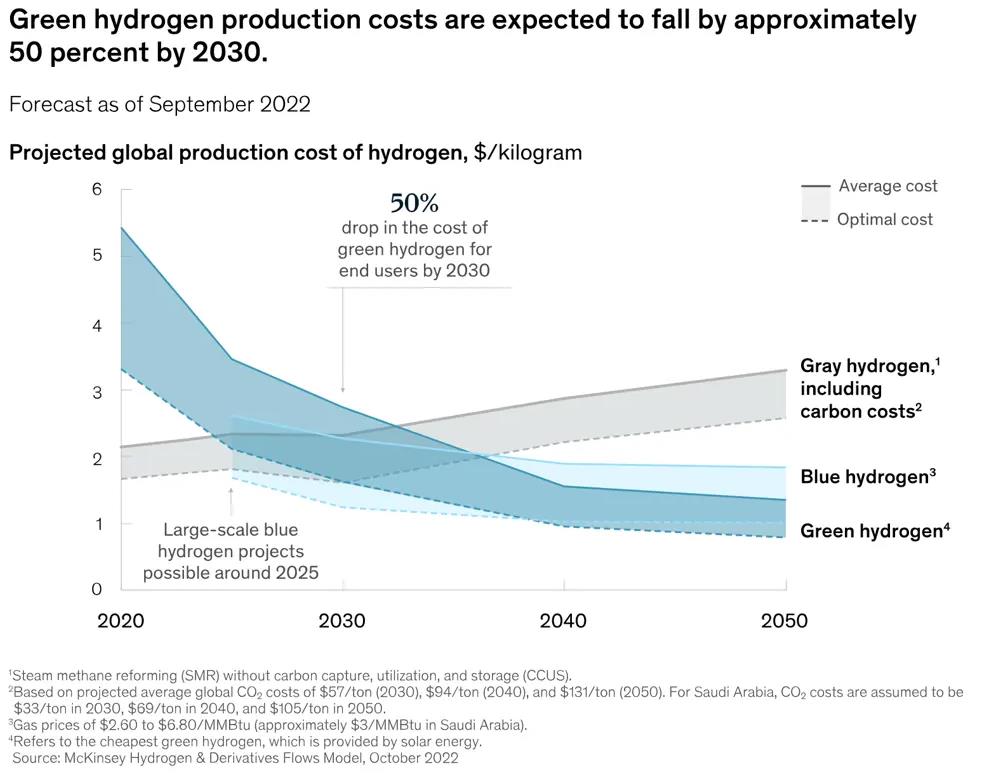 為了實(shí)現(xiàn)HRC的氫氣承諾,將需要擴(kuò)大藍(lán)氫和綠氫的競(jìng)爭(zhēng)供應(yīng)。隨著電解槽成本的下降,預(yù)計(jì)到2030年,綠氫成本將下降約50%。