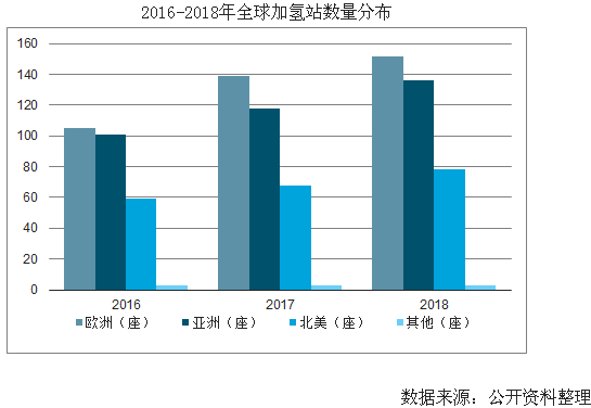 加氫站作為氫能源產業或者氫能源下游應用發展的重要基礎設施,是各國建設布局的重點。數據顯示,2018年全球新增48座加氫站,截止到2018年底,全球加氫站數目達到369座。其中,歐洲地區加氫站擁有量為152座,位居世界第一;亞洲136座、北美78座,其他地區僅3座。此外,在全部369座加氫站中,有273座對外開放,可以像任何傳統的零售站一樣使用;其余的站點則為封閉用戶群提供服務,比如公共汽車或車隊用戶。