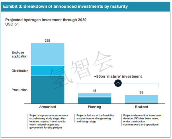 如果所有項目都取得成果,到2030年,總投資將超過3000億美元的氫能支出 — 相當于全球能源資金的1.4%。 然而,目前這項投資中只有800億美元可以認為是"成熟"的,這意味著投資要么處于規劃階段,要么已通過最終投資決定(FID),要么與正在建設、已經委托或運營的項目有關。
