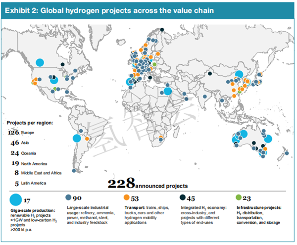 全球而言,價值鏈上共有228個氫氣項目。其中,已宣布的17個規模生產項目(即:可再生能源超過1 GW4,低碳氫年產量超過20萬噸),其中歐洲、澳大利亞、中東和智利是最大。