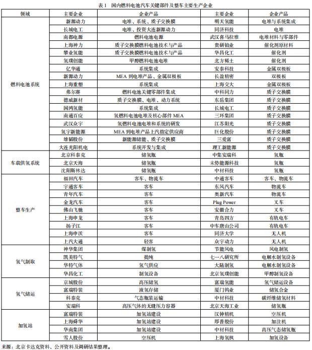 燃料電池汽車產業鏈內,已經集聚了數量較多的國內生 產企業。國內燃料電池汽車關鍵部件及整車主要生產企業如表 1 所示。