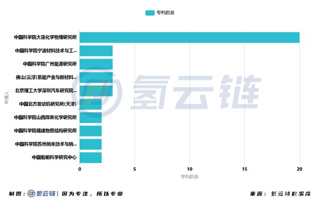 從科研機構來看,中科院大連化物所以20件,排名第一;中科院寧波材料所、中科院廣州能源所、佛山氫能產業與新材料所、北京理工大學深圳汽車研究院均以3件,并列第二;中國北方發動機研究所、中科院山西煤炭所、中科院福建物質所、中科院蘇州納米技術所和中國船舶研究中心以2件,并列第三。