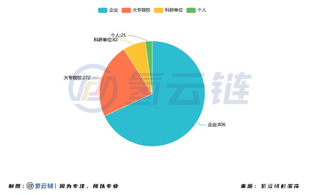 從專利申請人構成來看,企業申請數為806件,占比69.9%,排名第一;大專院校為272件,占比23.59%,排名第二;科研單位為82件,排名第三;個人申請有25件。