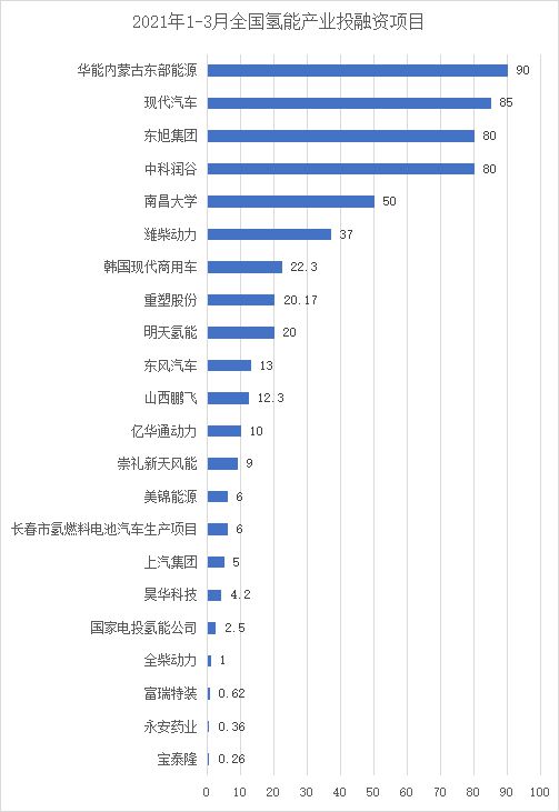 其中,投融資金額排名前7的分別是華能內蒙古東部能源、現代汽車、東旭集團、中科潤谷、南昌大學和濰柴動力。華能內蒙古東部能源開發的風光儲高比例耦合綠電制氫示范項目總投資額約為90億元,位居首位。[5]