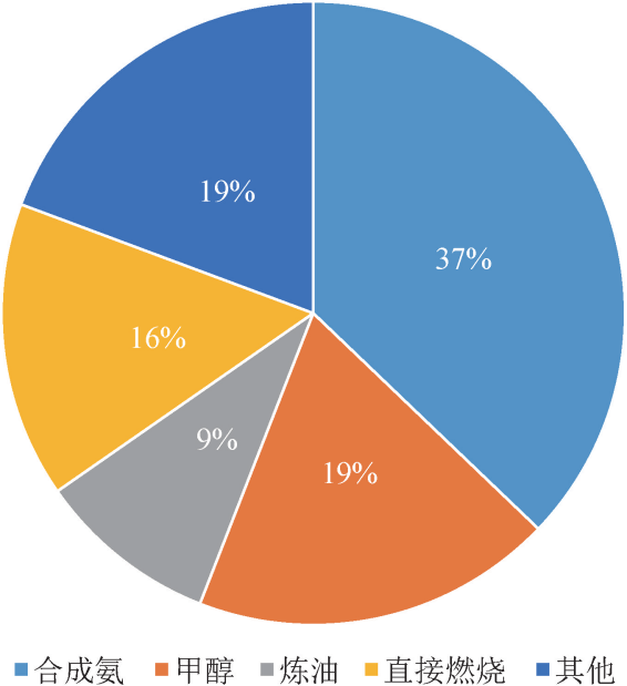 由圖3可以看出,據莫尼塔研究分析[3],2017年我國氫氣消費量超過2500萬t,基本全部用于工業.其中, 生產合成氨用氫占比為37%、甲醇用氫占比為19%、煉油用氫占比為10%、直接燃燒占比為15%. 在合成氨和甲醇生產過程中, 需要使用氫氣與氮氣或一氧化碳發生反應,而氫氣則由煤炭、天然氣等化石能源制成.在煉油過程中,需要使用氫氣對油品進行加氫裂化、加氫精制等處理,以獲得更多高附加值產品.此外在發電行業、食品加工行業、電子器械制造業等行業,也會使用氫氣作為生產原料或保護氣.總之,工業領域主要將氫氣作為原料來使用,而并非能源,氫氣扮演的依舊是工業原料的角色.