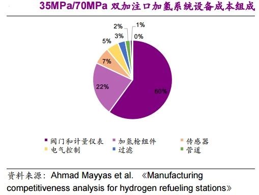 (1)最重要的設備成本是閥門和計量儀表,占設備成本的60%左右。用于監(jiān)測壓力和氫氣泄漏的傳感器也是加氫系統(tǒng)成本的重要組成部分;