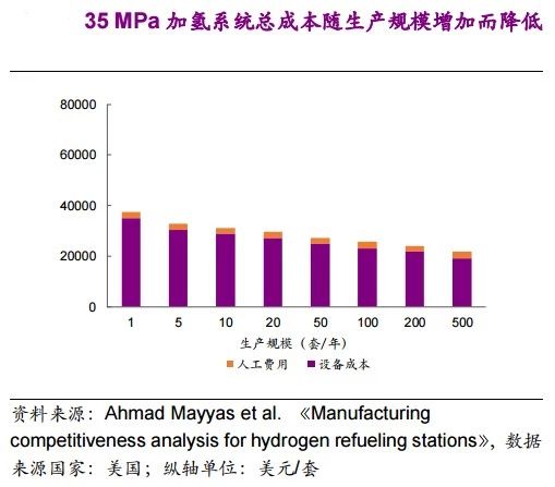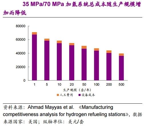 隨著生產規(guī)模從10套/年增加到500套/年,加氫系統(tǒng)總成本可降低30%-35%。