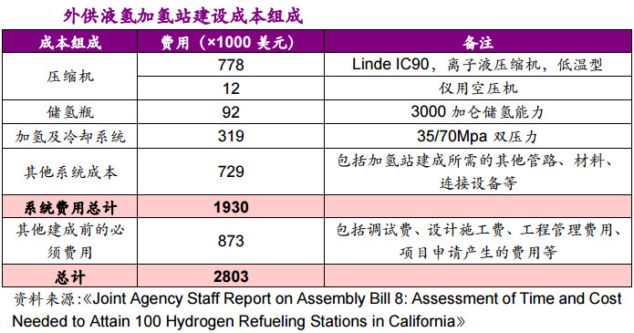 加州能源局研究數(shù)據(jù)顯示,外供液氫加氫站建成所需的與設備相關的費用約為193萬美元(高于外供氫高壓氫氣加氫站的160萬美元),考慮成本的投入使用之前,需要調試,工程設計成本、管理成本、施工成本等成本,總成本約280萬美元。