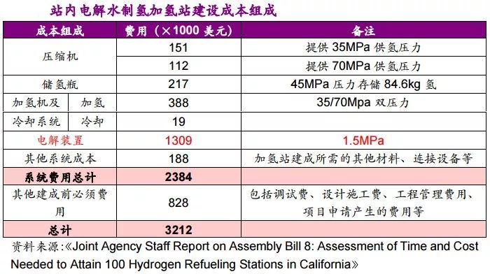 美國加州加氫站采用現(xiàn)場電解水生產氫氣。該加氫站日供氫能力130kg/d,加氫壓力35MPa、70MPa兩種。加氫站的建設成本分析如下。