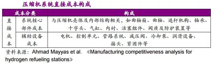 假如加氫站壓縮系統(tǒng)選用活塞式壓縮機,直接成本包含壓縮機外殼及內部結構加工生產制造有關系統(tǒng)核心部件的成本費用,以及電機、控制單元和管道系統(tǒng)相關的輔助設備的成本。