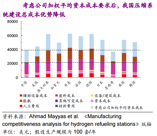 (3)我國加氫站壓縮系統(tǒng)建設成本低的優(yōu)勢在于勞動力成本和設備/建設成本低。