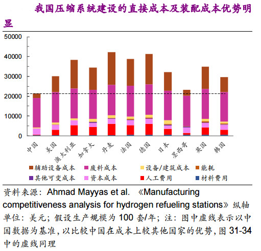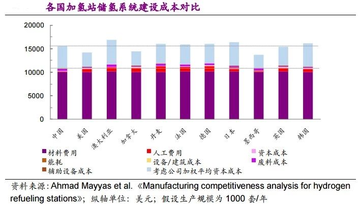 (3)我國加氫站儲氫系統(tǒng)的建設成本優(yōu)勢仍來自于中國低廉的勞動力成本。