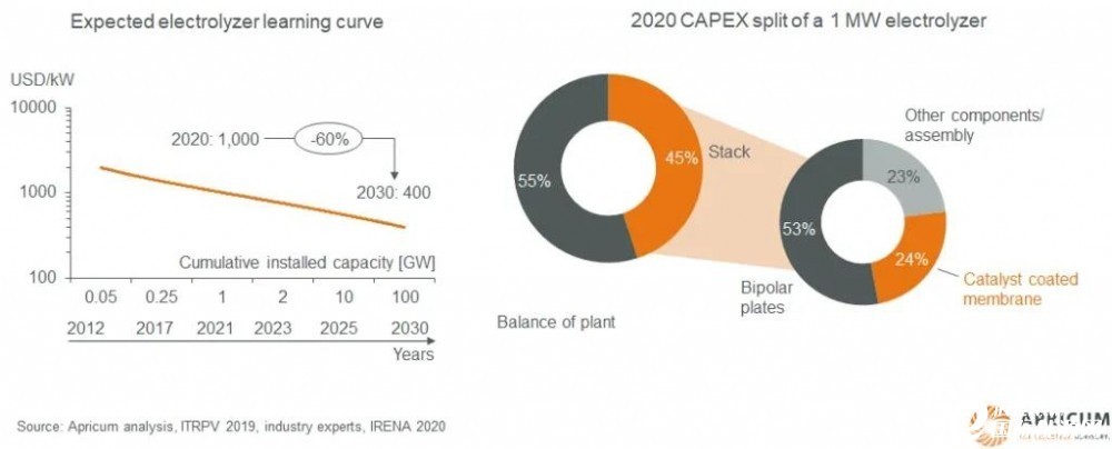 1MW電解槽的預期電解槽學習曲線和2020年資本支出分割