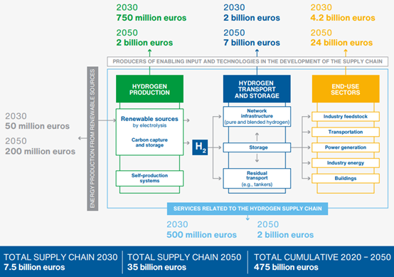 在發(fā)展情景中,氫供應(yīng)鏈的總價(jià)值在2030年為45億歐元,在2050年為210億歐元,2020-2050年期間的總價(jià)值為2850億歐元。