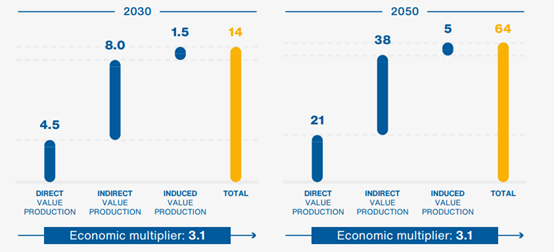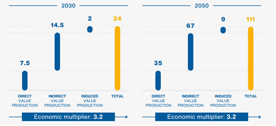 如果我們分析加速發(fā)展的情景,這些影響更為顯著,即供應(yīng)鏈的總價(jià)值在2030年達(dá)到75億歐元,在2050年達(dá)到350億歐元,2020-2050年的累計(jì)價(jià)值超過(guò)4750億歐元。