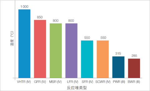 核能制氫的技術路線可分為核電制氫(機組為制氫提供電能)、核熱制氫(機組為制氫提供熱能)和電熱混合制氫(機組為制氫提供熱能和電能)三種。能夠與制氫工藝耦合的反應堆有多種選擇,但從制氫的角度來看,制氫效率與工作溫度密切相關,高溫(出口溫度700-950℃)和超高溫反應堆(出口溫度950℃以上)是最優選擇。