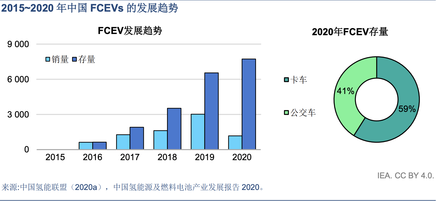 國內對氫燃料電池汽車在交通領域中的定位也達成了一定共識,認為燃料電池更適用于中長途運輸的中重載商用汽車,因此從商用車領域率先推廣氫燃料電池汽車是一個很好的切入點。根據中國氫能聯盟的數據顯示,截止2020年底,中國已經部署了超過7700輛燃料電池汽車,主要是公交車和卡車。
