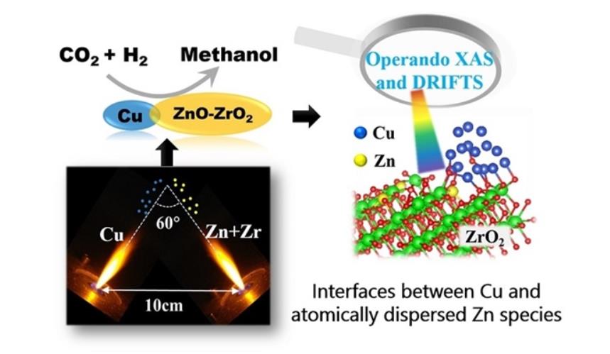 近日,中科院大連化物所碳資源小分子與氫能利用研究組(DNL1905組)孫劍研究員、俞佳楓副研究員團隊與德國卡爾斯魯厄理工學院Grunwaldt教授合作,利用雙噴嘴火焰噴射裂解法(DFSP)對經典的銅—鋅—鋯三元催化材料結構進行精細調控,通過多種原位表征手段揭示了氧化鋅在二氧化碳加氫制甲醇反應體系下的結構敏感性。