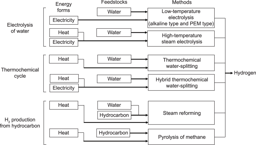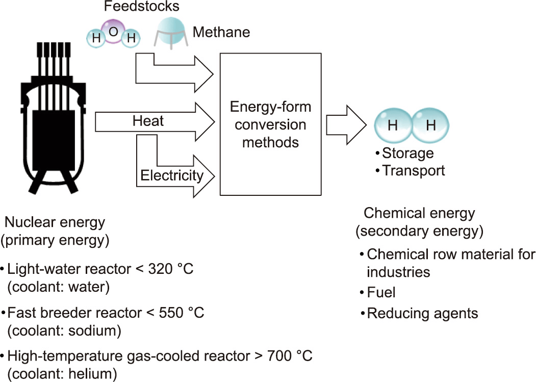 由于低溫水電解法可以僅由電能驅動,因此可以使用輕水反應器、快中子增殖反應器或高溫氣冷反應器作為能源。高溫蒸汽電解所需的水汽化熱(i)也可以由輕水反應堆、快中子增殖反應堆或高溫氣冷反應堆提供。