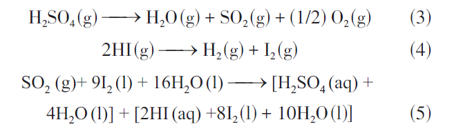 其中,“aq”表示水溶液。反應(3)是硫酸(H2SO4)分解反應,在氣相中熱分解H2SO4產生氧氣,反應(4)是碘化氫(HI)分解反應,在氣相中熱分解HI產生氫氣。反應(5)稱為本生反應,是水、二氧化硫和碘反應生成硫酸和HI的一種液相反應。本生反應中產生的H2SO4和HI可以通過液-液相分離現象分離為上層液相和下層液相。