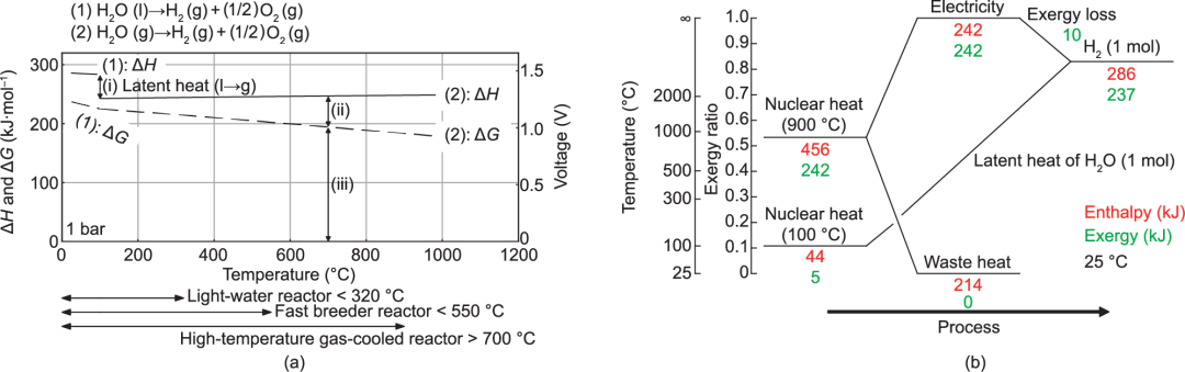 圖3.(a)水分解反應的ΔH-T和ΔG-T圖;(b)高溫蒸汽電解的能量轉換圖。