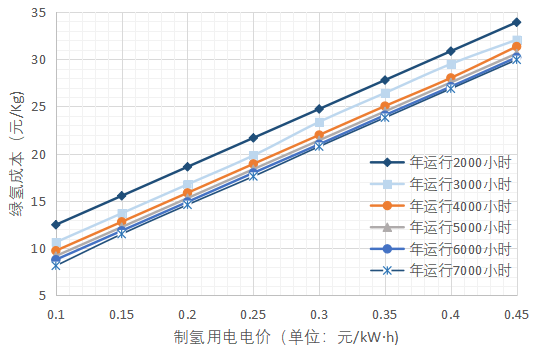 按照用電價格0.25元/kW·h,年運行小時數4000小時計算,制氫成本約為19元/kg,電價每降低0.05元/kW·h,制氫成本將降低約3元/kg。