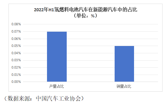2022年1-6月,中國新能源汽車的產銷量分別達到了266.1萬輛和260.0萬輛。其中,燃料電池汽車產銷量分別為1803輛和1379輛,占比分別為0.07%和0.05%。可以看出,氫燃料電池汽車仍是市場中較為小眾的新能源汽車產品。