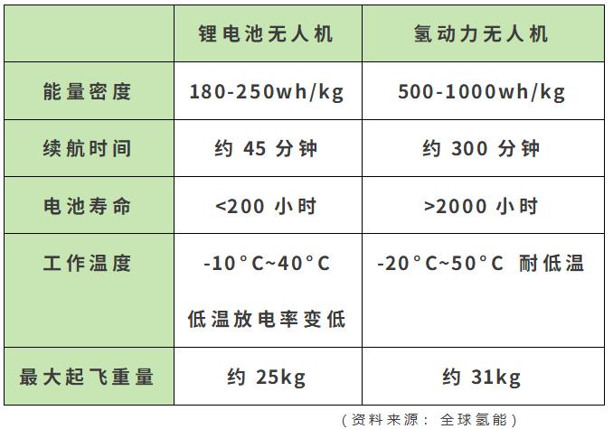 “通勤”時間過長,限制了鋰電無人機的工作效率,頻繁的充電和更換電池也增加了人工成本。氫動力無人機在燃料電池的應用彌補了鋰電池的能量密度低的問題。