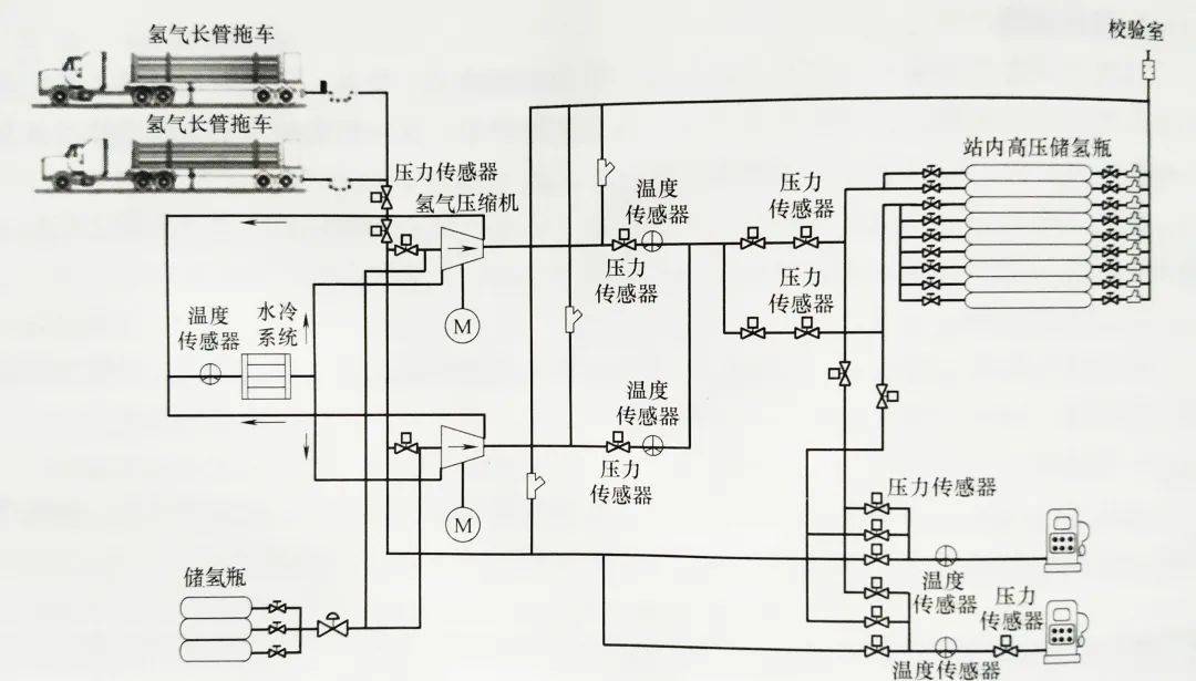 站外制氫是指氫氣在制氫廠集中制取,然后輸送到加氫站,輸送方式有高壓氫氣輸送?液氫輸送和管道輸送等?其特點是氫氣集中制取可以降低制氫成本,站外制氫(Off-site)型加氫站工藝流程如圖1-4所示。