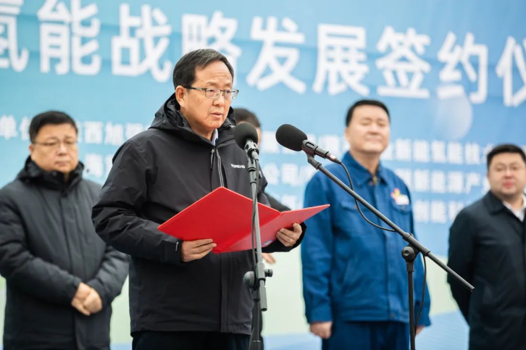 陜西省能源局副局長劉齊,韓城市委副書記張景鋒,韓城市政府黨組成員、副市長郭繼鋒,陜西省工業(yè)和信息化廳原材料工業(yè)處副處長謝韜,陜鋼集團(tuán)副總經(jīng)理韋武強(qiáng)、龍鋼公司黨委書記、董事長陳驍、維納氫能執(zhí)行董事宋琦、旭強(qiáng)瑞公司總經(jīng)理王進(jìn)輝等氫能企業(yè)代表共同出席。
