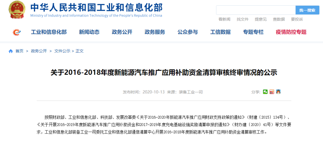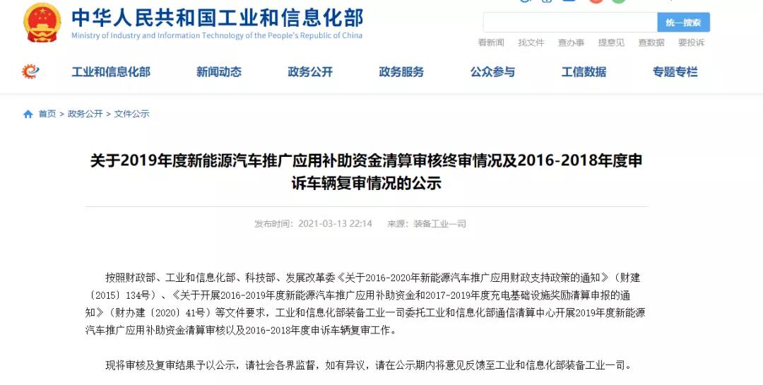 近日,工信部正式對(duì)外發(fā)布關(guān)于2019年度新能源汽車(chē)推廣應(yīng)用補(bǔ)助資金清算審核終審情況及2016-2018年度申訴車(chē)輛復(fù)審情況的公示。