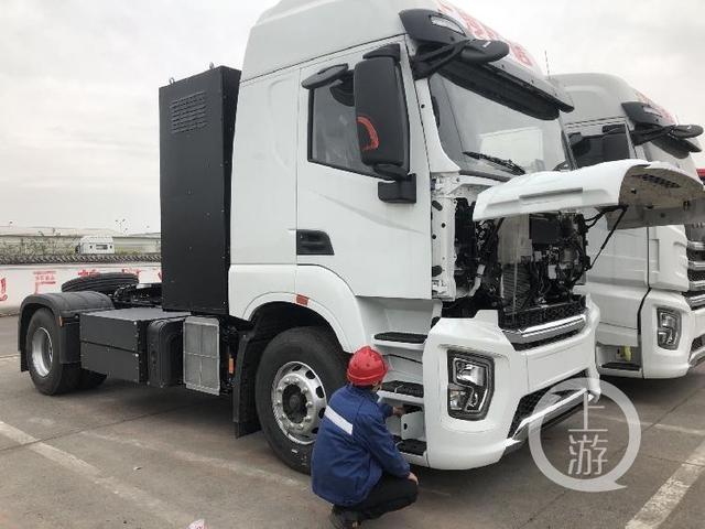 在上汽紅巖的特裝車間外,多輛杰獅H6正在接受工程師的檢查。它們是重慶生產的首批氫能源重卡,目前已經具備實際工況應用條件。